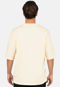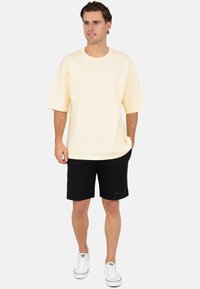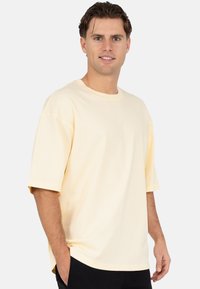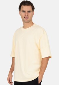 T-shirt a maniche corte e collo rotondo di colore giallo chiaro. Tessuto morbido con vestibilità rilassata. Design semplice senza motivi o dettagli visibili.