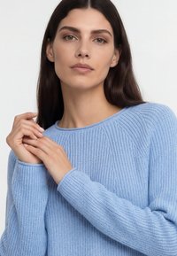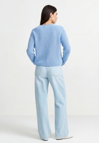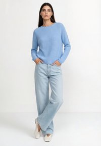Donna che indossa un maglione di maglia azzurro chiaro, jeans a gamba larga in denim chiaro e scarpe slip-on bianche intrecciate, in piedi con le mani nelle tasche.