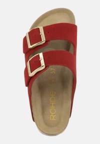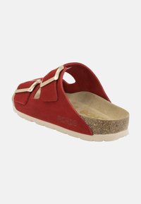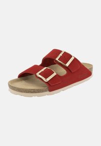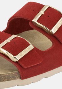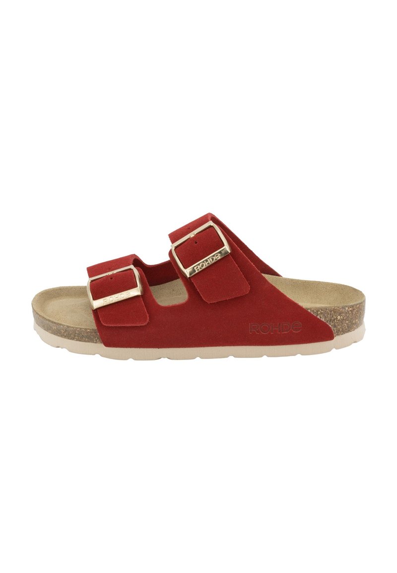 Sandalo in suede rosso con due cinturini regolabili, fibbie color oro, sottopiede in sughero e suola in gomma beige. Design con suola piatta per il massimo comfort.