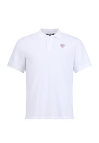 Uomo che indossa una polo blu e un cappellino blu navy con il logo "Rossignol", in piedi davanti a uno sfondo chiaro e uniforme.