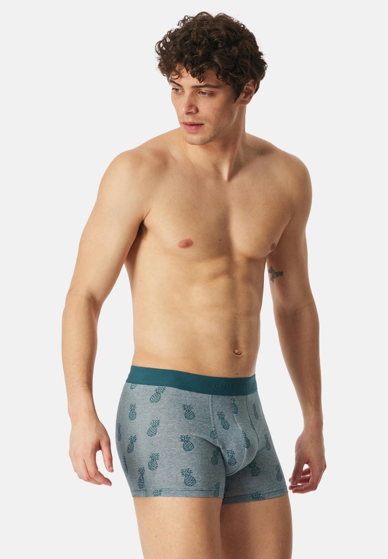 Boxer da uomo blu-grigio con motivo a ananas, tessuto morbido, elastico in vita e vestibilità aderente. Nessun dettaglio aggiuntivo presente.