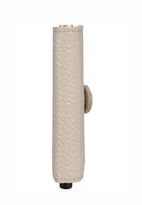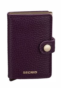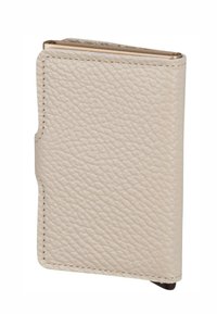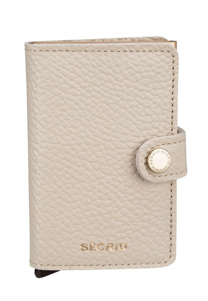 Portafoglio in pelle beige con finitura testurizzata, dotato di chiusura a scatto e dettagli in oro. Logo "SECRID" impresso sulla parte anteriore.