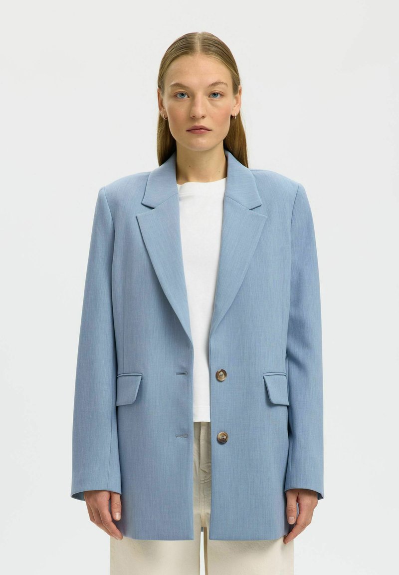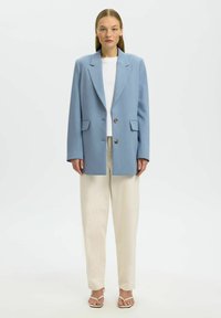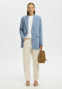 Donna che indossa un blazer oversize azzurro chiaro con due bottoni sopra una camicia bianca e pantaloni beige, in piedi davanti a uno sfondo semplice.