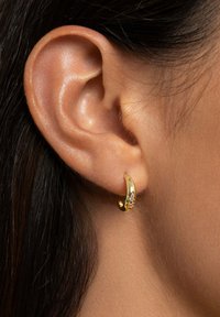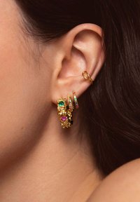 Mini cerchi realizzati in argento sterling e placcatura oro con zirconi verdi, rossi e rosa che formano una galassia stellare. Prendi degli orecchini a cerchio.