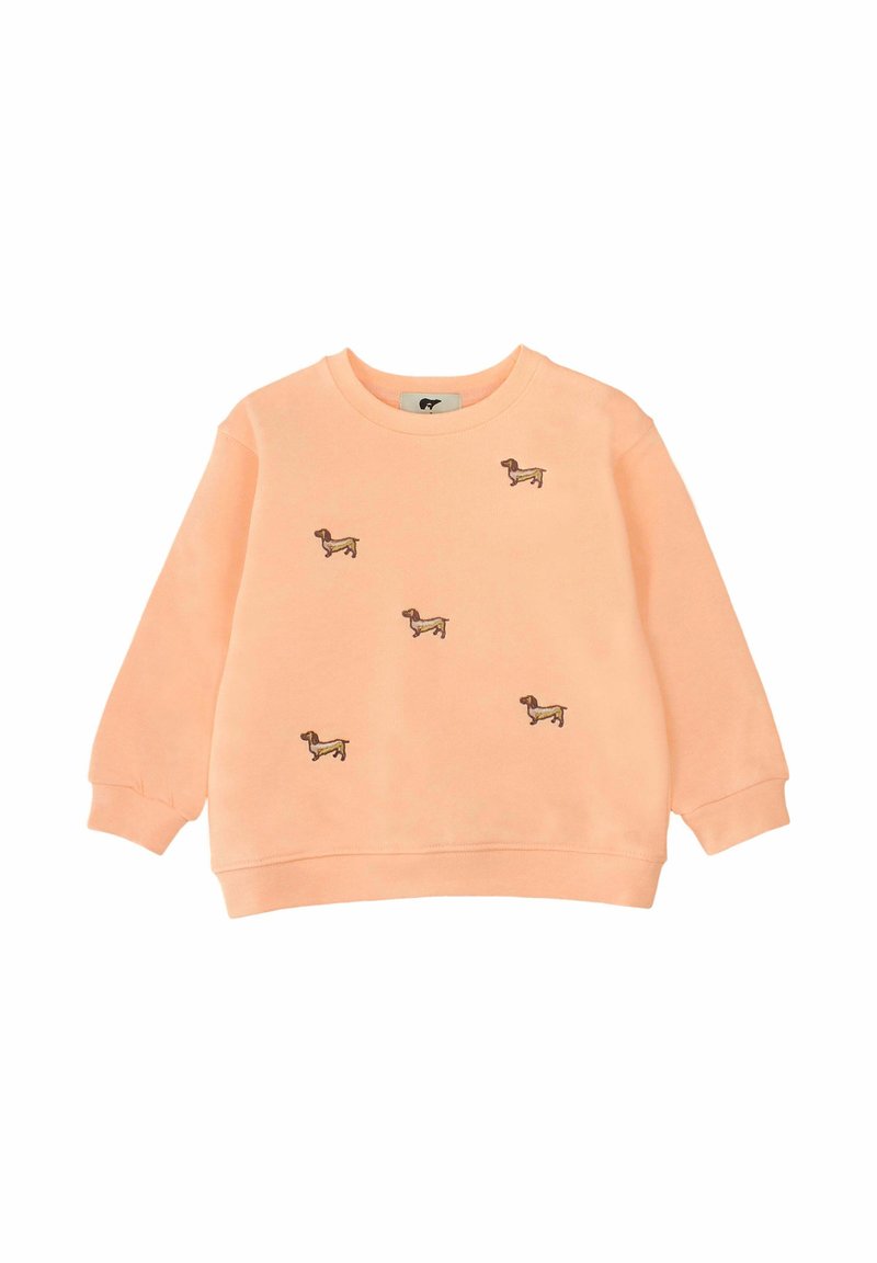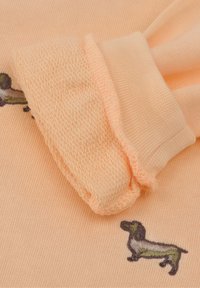 Felpa a maniche lunghe color pesca con cinque piccoli motivi ricamati di bassotti marroni distribuiti sul davanti.