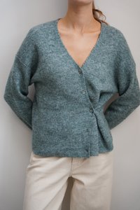 Cardigan lavorato a maglia color verde turchese con scollo a V, maniche lunghe e chiusura con bottoni. Indossato sopra una maglietta chiara e abbinato a una gonna marrone. Tessuto morbido.