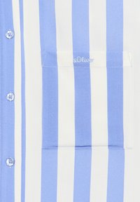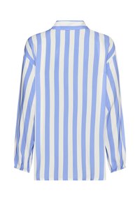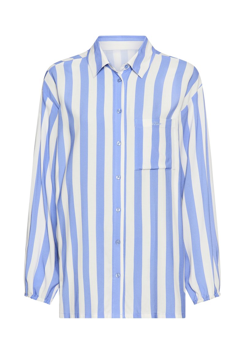 Camicia a maniche lunghe con righe verticali blu e bianche, chiusura frontale con bottoni, collo a camicia, taschino sul petto e polsini elastici.