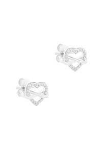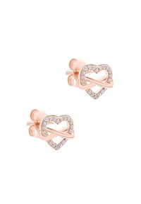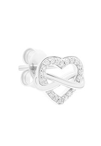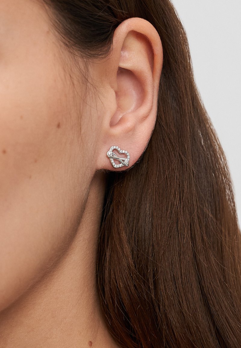 Primo piano dell'orecchio di una donna che indossa un orecchino a forma di cuore in argento con cristalli incastonati e una barra diagonale attraverso il cuore.