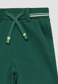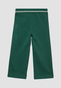 Pantaloni larghi per bambini di colore verde scuro con vita elastica a righe e dettaglio con coulisse, dotati di tasche frontali.