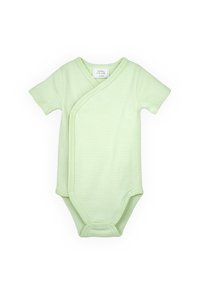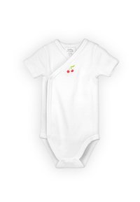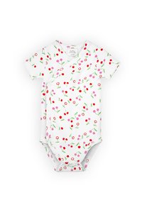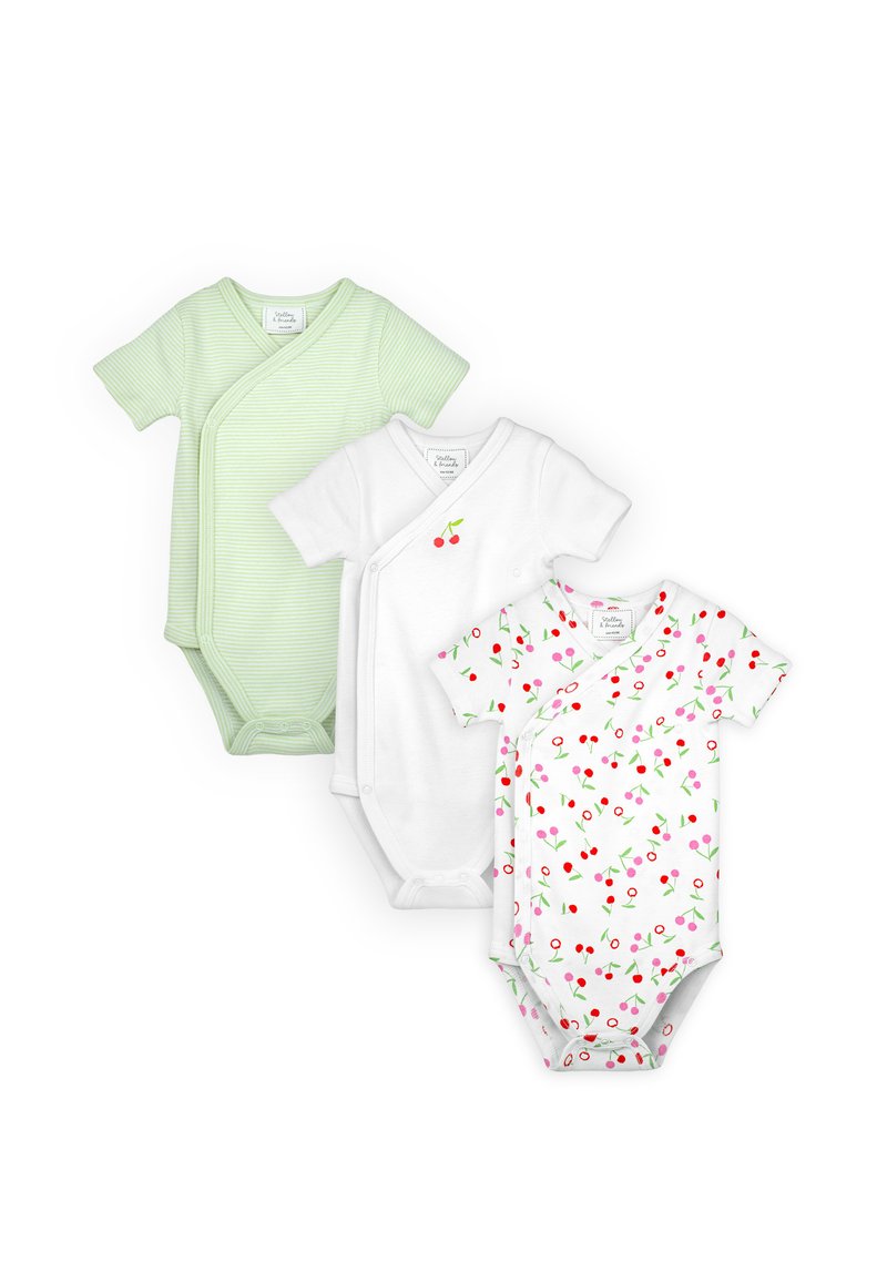 Tre body per neonati a maniche corte: uno a righe verdi, uno bianco con ricamo di ciliegie, uno bianco con motivo di ciliegie rosse e rosa.