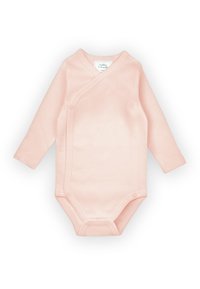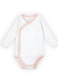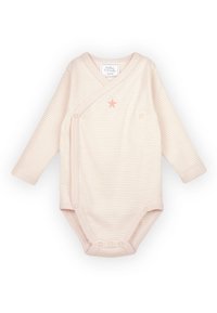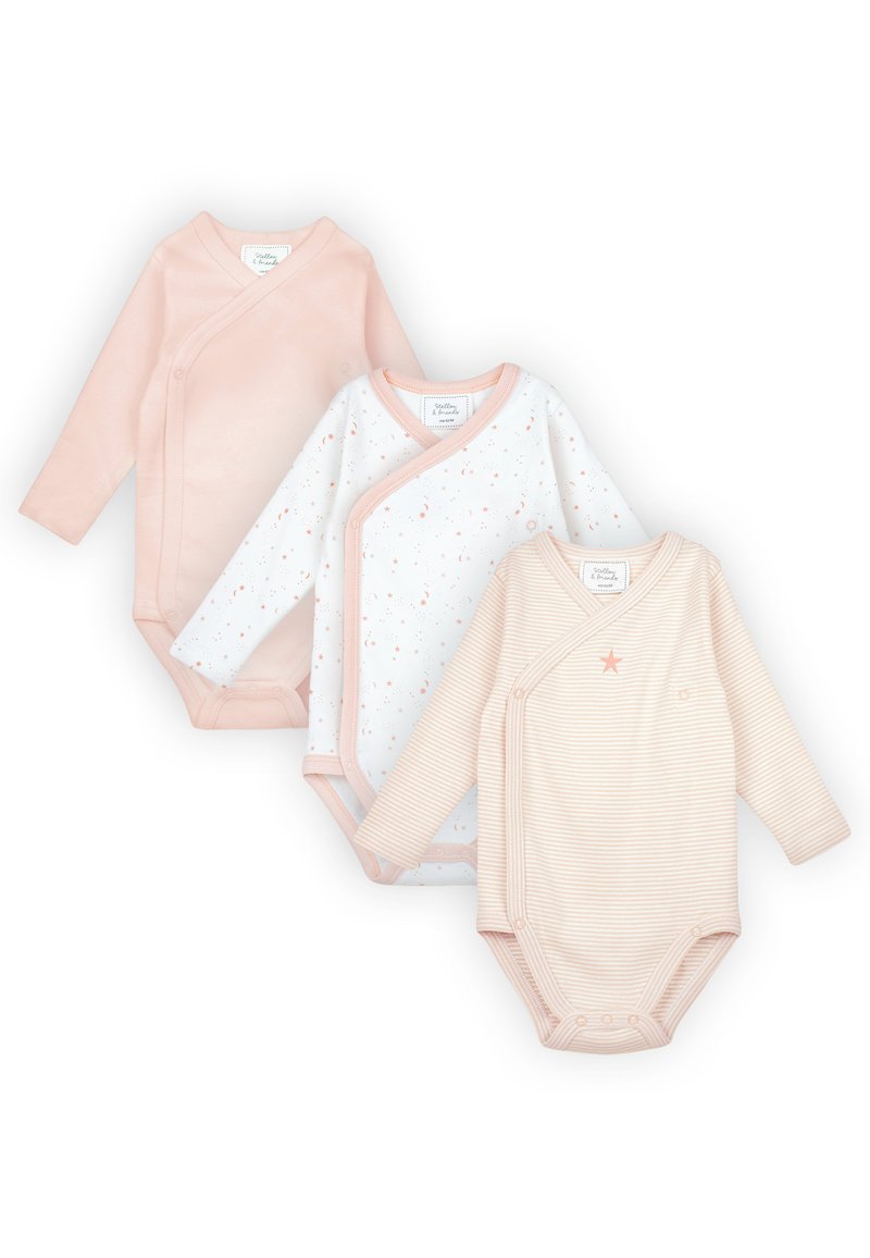 Tre body per bambini a maniche lunghe in rosa tenue, bianco con motivi a stelle e a righe rosa con dettaglio a stelle, disposti distesi su uno sfondo bianco.
