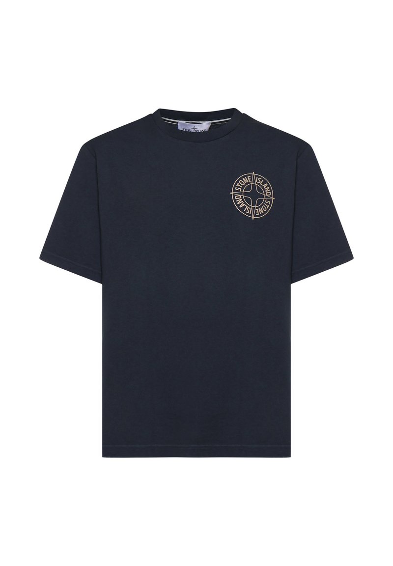 T-shirt a maniche corte blu navy con scollo rotondo e piccolo logo beige della bussola Stone Island sul petto sinistro.