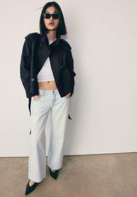 Donna con capelli corti neri che indossa una giacca nera doppiopetto con cintura e occhiali da sole rettangolari neri, con la mano nella tasca dei jeans azzurri con borchie.