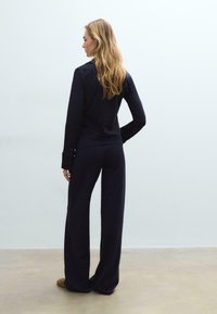 Persona che indossa pantaloni neri a gamba larga a vita alta e scarpe marroni senza lacci, in piedi su un pavimento in cemento liscio contro una parete bianca.