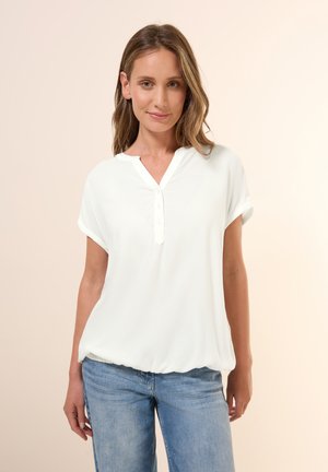 Top bianco a maniche corte con scollatura a V, realizzato in tessuto morbido, abbinato a pantaloni beige, con un'ombra sottile proiettata sul muro.