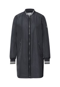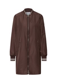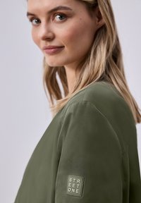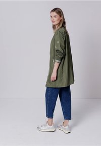 Donna bionda che indossa una lunga giacca verde oliva con zip, una maglia beige chiaro e jeans blu, in piedi con le mani nelle tasche davanti a uno sfondo semplice.