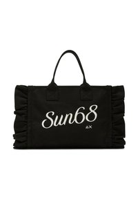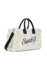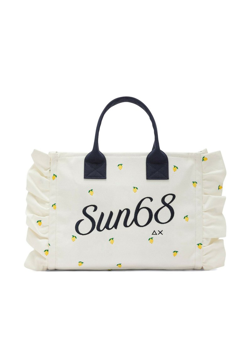 Borsa a tracolla bianca con manici neri, piccoli motivi di limoni gialli, lati arricciati e scritta "Sun68" stampata in nero sul davanti.