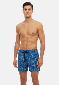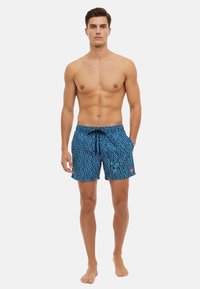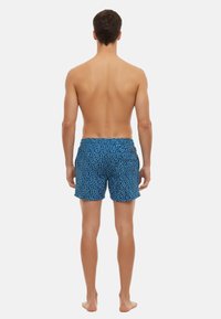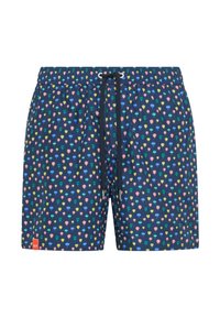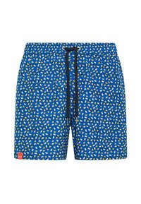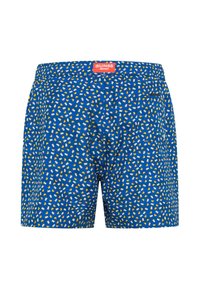 Uomo senza maglietta con capelli corti castani che indossa pantaloncini da bagno blu con motivo bianco e giallo, in piedi davanti a uno sfondo semplice.