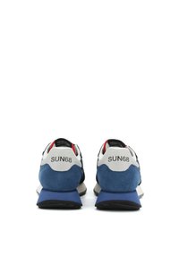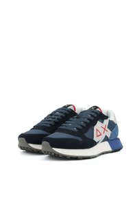 Scarpa da ginnastica atletica blu navy e bianca con simboli geometrici rossi sul lato, tallone in suede blu e suola bianca ammortizzata.