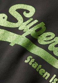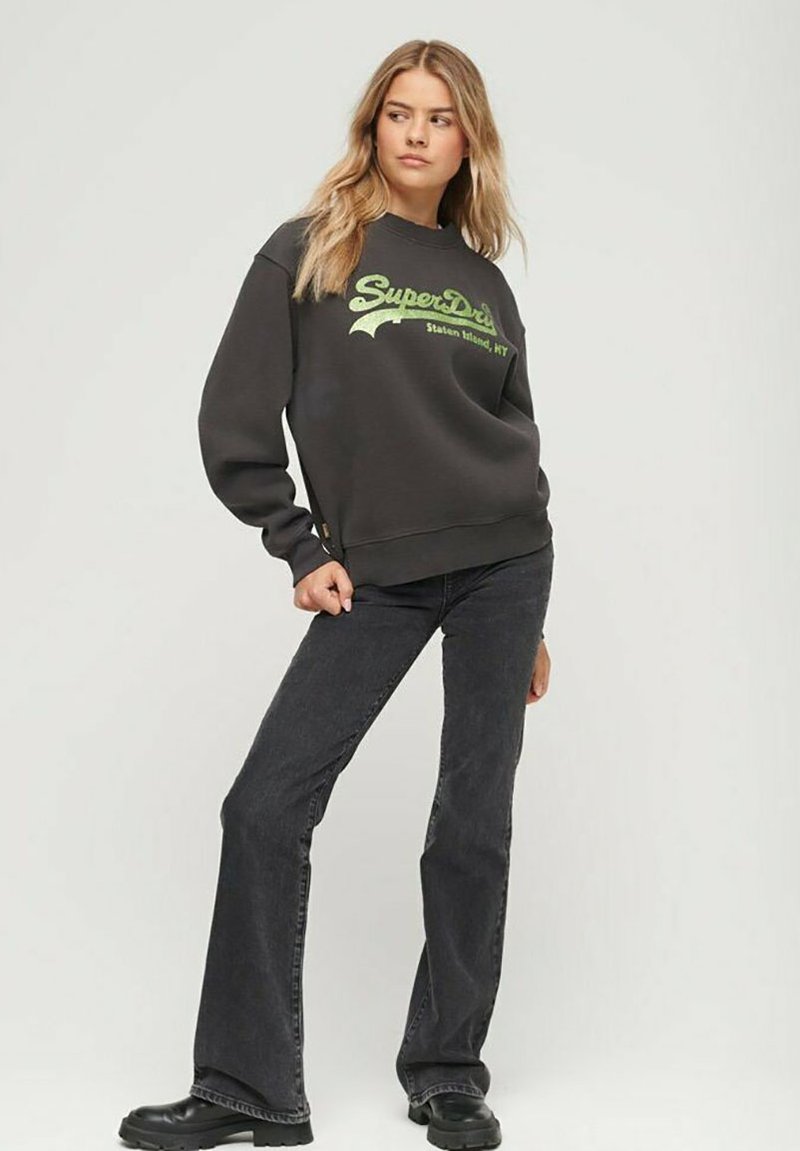 Felpa nera con logo "SuperDry" verde, abbinata a jeans neri a zampa d'elefante. Modello indossa stivali neri chunky, in piedi su uno sfondo neutro.