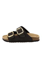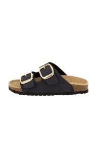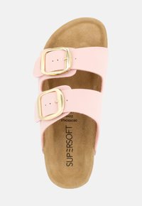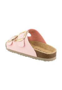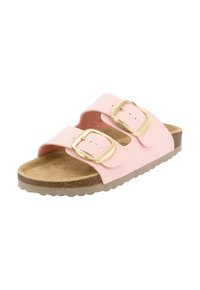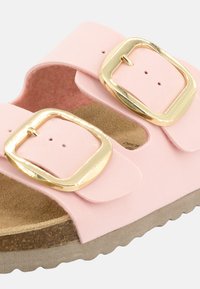 Sandalo con slide rosa con due fibbie dorate regolabili, plantare sagomato in sughero e suola testurizzata per una presa migliore.