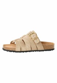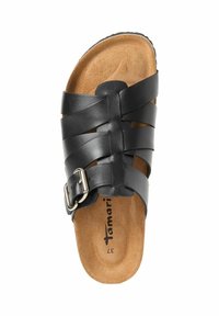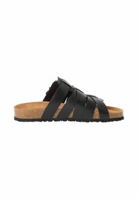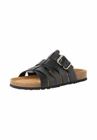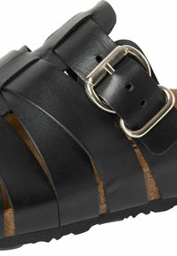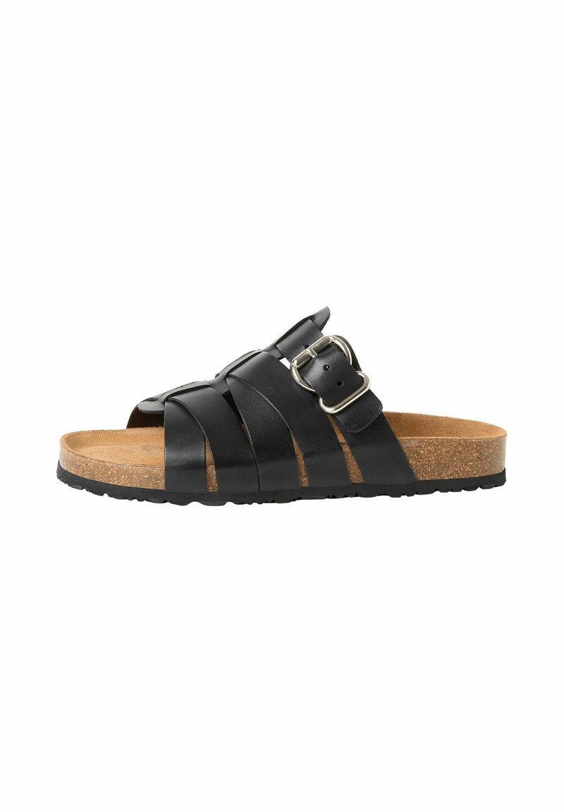 Sandalo in pelle nera con design a fascia incrociata, fibbia regolabile, suola in sughero e suola in gomma texturizzata. Stile casual adatto all'estate.