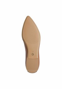 Mocassini in pelle marrone con suola piatta, punta appuntita e un dettaglio cucito sulla parte anteriore. Texture liscia con dettagli minimi.