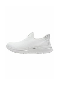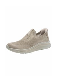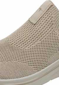 Sneakers leggere color beige con tomaia in mesh e design slip-on. Suola in gomma che offre ammortizzazione; abbinate a denim blu e calzini bianchi.