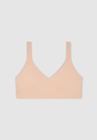 Senza ferretto, reggiseno wireless in nude con design senza cuciture, spalline larghe e texture morbida. Presenta un delicato scollo a V e una leggera sagomatura.