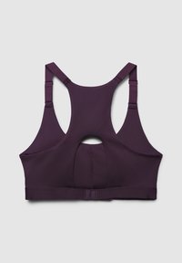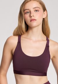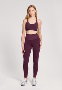 Bra sportivo bordeaux e leggings a vita alta abbinati, realizzati in tessuto elasticizzato. Il reggiseno presenta un collo a barca e spalline regolabili.