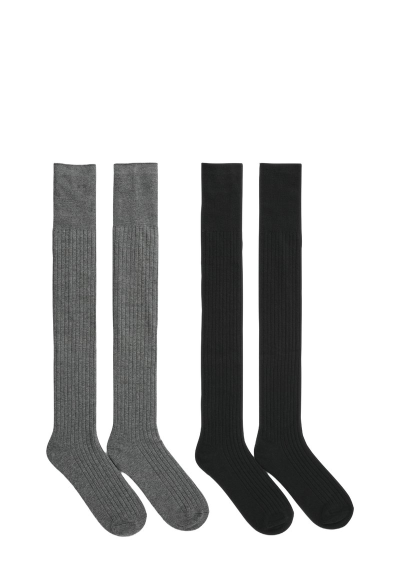 Set di quattro calze fino al ginocchio: due in grigio scuro con texture a costine e due in nero uniforme, tutte con un bordo superiore liscio.