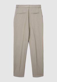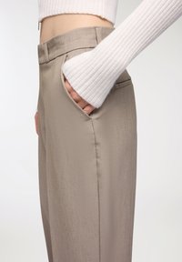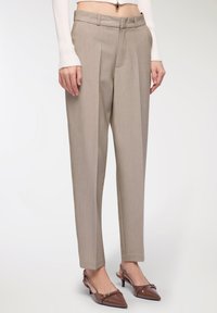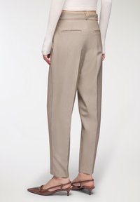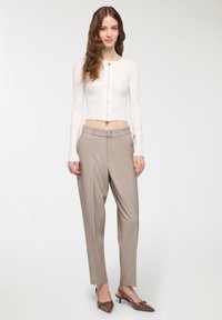 Pantaloni beige su misura con piega frontale, abbinati a décolleté in vernice marrone con punta affusolata e un maglione corto a coste bianco.
