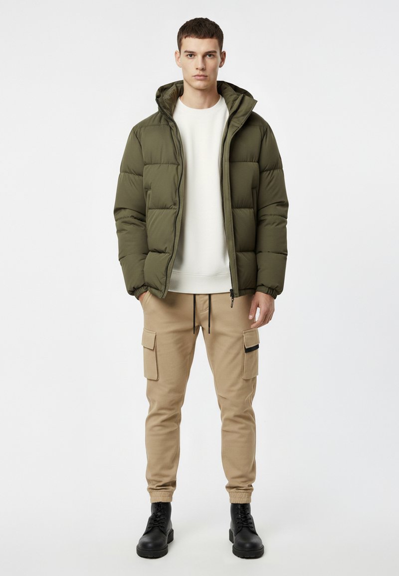 Giacca a vento verde oliva con cappuccio, trama trapuntata, abbinata a pantaloni cargo beige con tasche laterali e accenti neri, stivali neri.