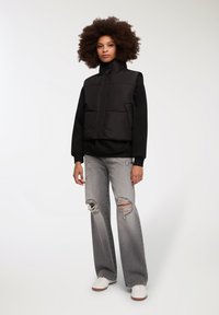 Gilet piumino nero con colletto alto, pannelli rettangolari e tasche frontali, indossato sopra una felpa nera. Modello abbinato con jeans grigi scuciti.