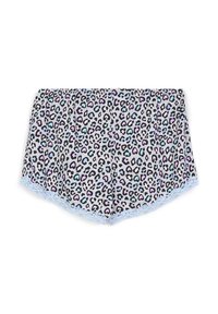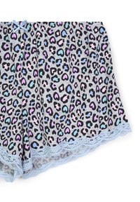 Camisola azzurra chiara con pizzo sul bordo e un fiocco al collo, abbinata a pantaloni corti con una stampa leopardata colorata e orli in pizzo.