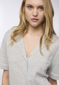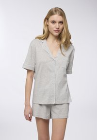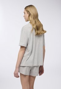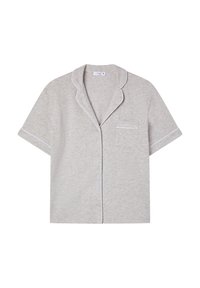 Pigiama grigio chiaro realizzato in tessuto morbido, con maniche corte, colletto e piping bianco a contrasto; include pantaloni corti.