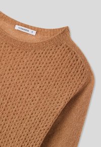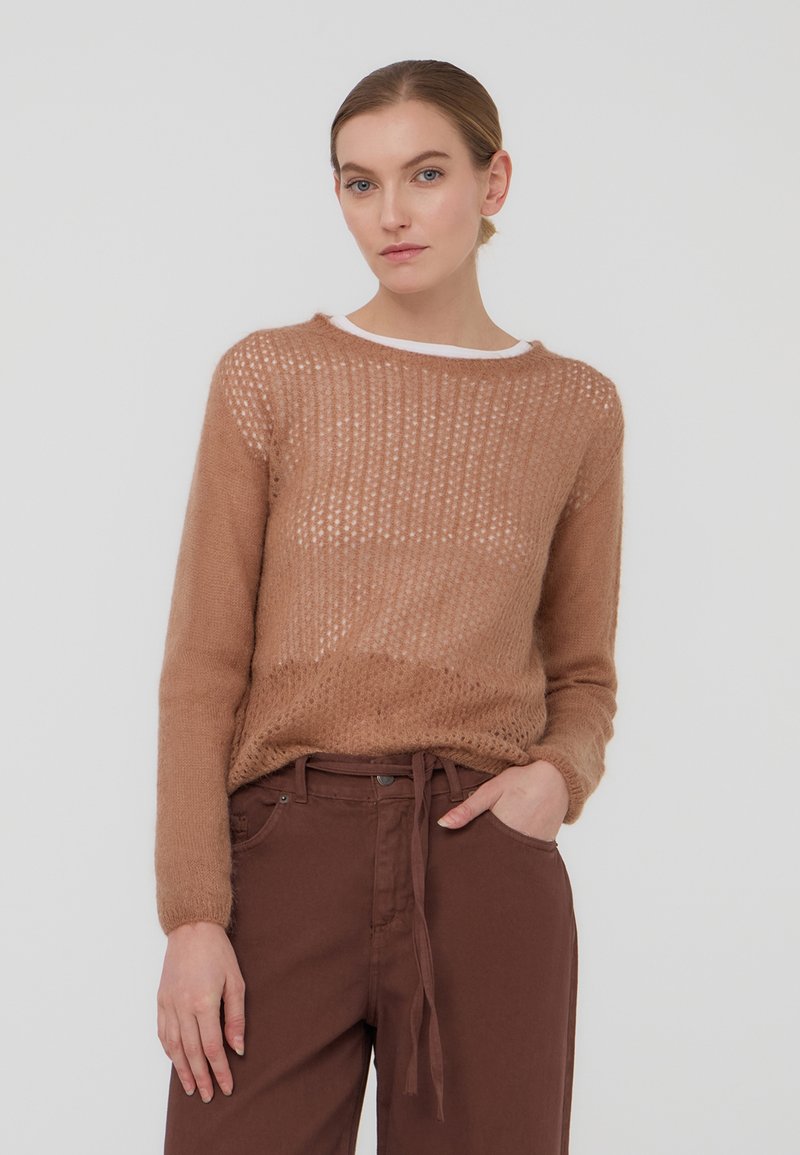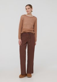 Donna che indossa un maglione marrone chiaro a maglia con maniche lunghe e pantaloni a vita alta marrone scuro con cintura annodata, posando con una mano in tasca.