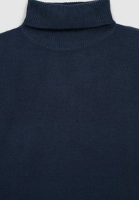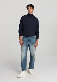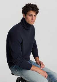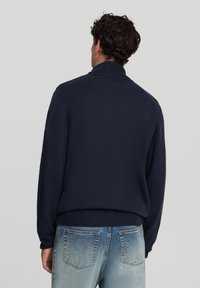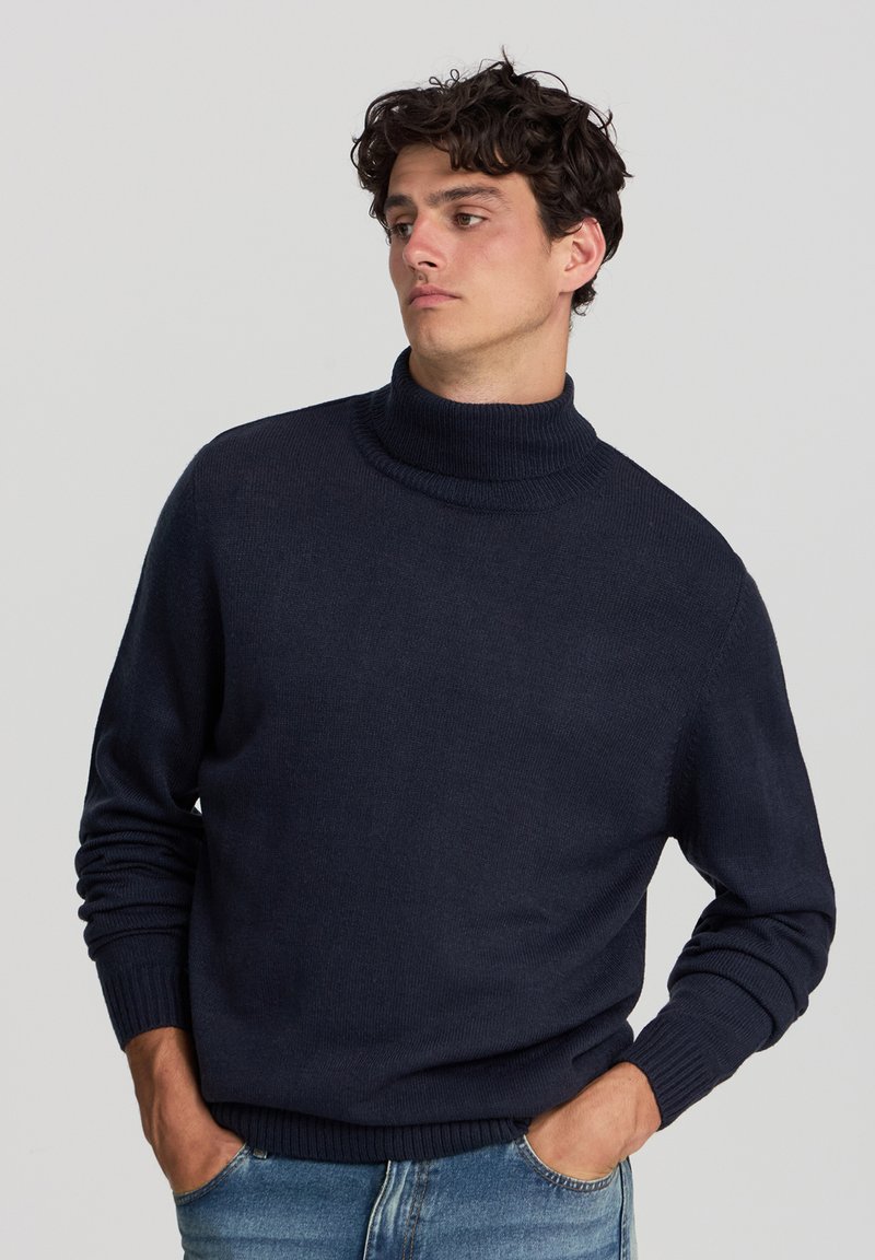 Maglione a collo alto blu navy con texture a coste, caratterizzato da maniche lunghe e una vestibilità rilassata. Abbinato a jeans azzurri.