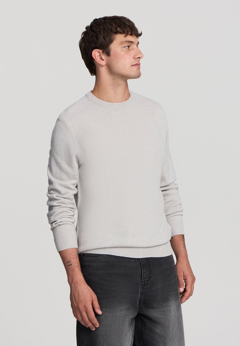 Maglione grigio chiaro realizzato in tessuto a maglia, con scollatura a girocollo e polsini a costine. Indossato con jeans grigio scuro, il modello è rivolto di lato.