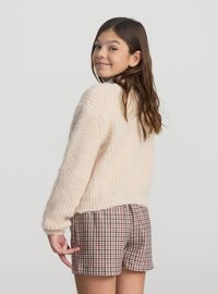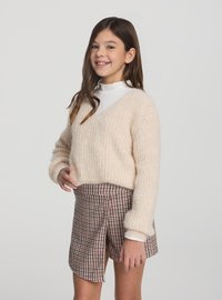 Maglione in maglia crema con scollo a v, minigonna a quadri in toni marroni e rossi, e stivali da cowboy in suede marrone con ricami intricati.