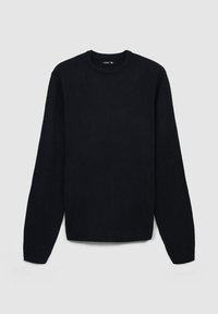 Maglione nero in maglia con scollatura a girocollo, a costine nei polsini e nell'orlo. Indossato sopra una camicia bianca, abbinato a jeans grigio chiaro. Texture liscia.