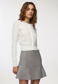 Donna con capelli ricci che indossa un cardigan bianco decorato con perle e una gonna a trapezio grigia, in piedi contro uno sfondo chiaro e uniforme.