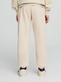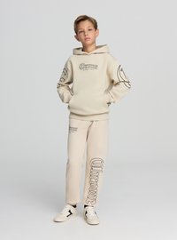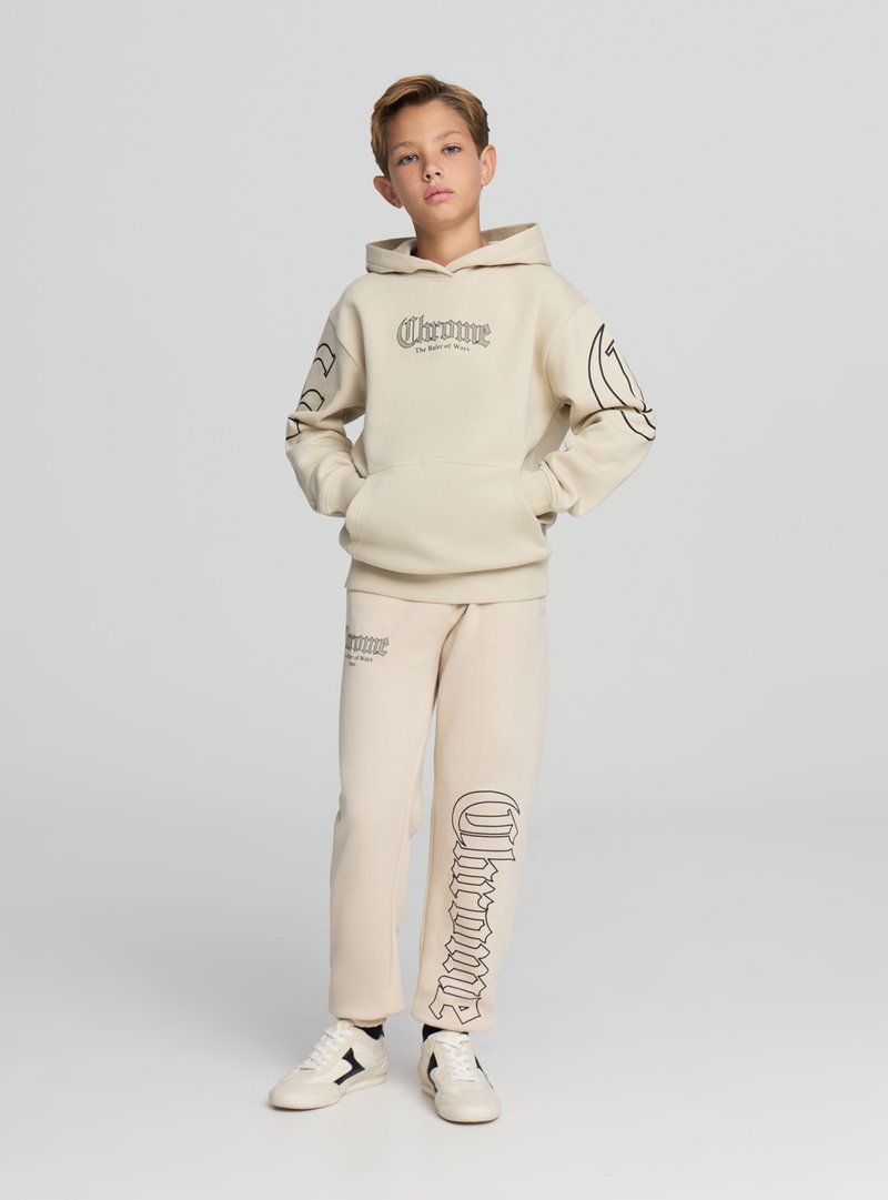 Ragazzo giovane in piedi con le mani nelle tasche, indossa una felpa con cappuccio beige e pantaloni della tuta coordinati con scritte nere e sneakers bianche.