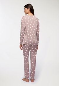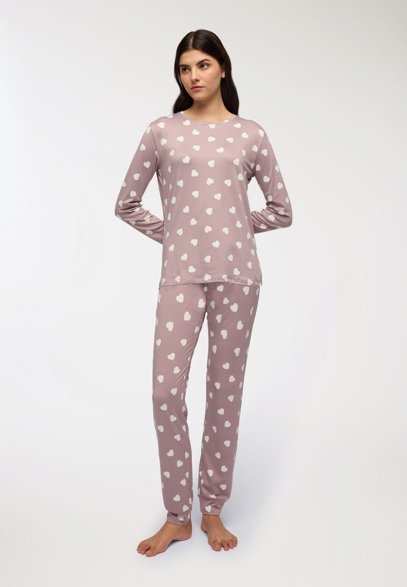 Set di pigiama a maniche lunghe, rosa chiaro, con motivi a cuori bianchi; tessuto morbido, vestibilità comoda e pantaloni dritti con cintura elastica.