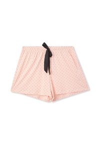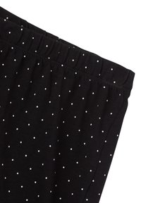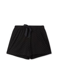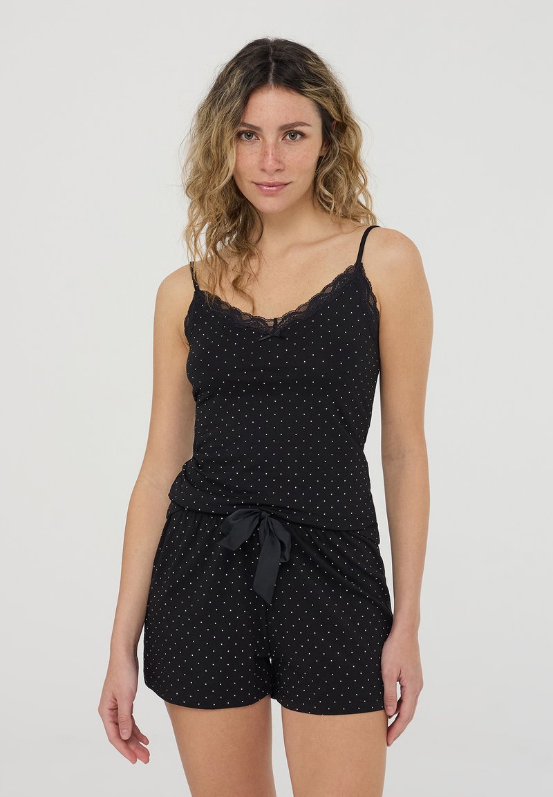 Completo pigiama nero con pois bianchi, composto da un canottiera con pizzo e pantaloni corti con un fiocco frontale. Realizzato in tessuto morbido.