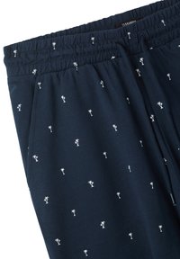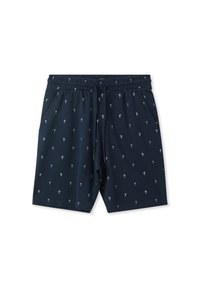 Pantaloni corti blu navy in cotone, con un motivo di palme bianche, dotati di vita elastica e cordoncino regolabile.