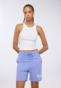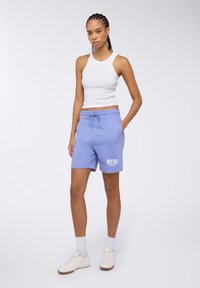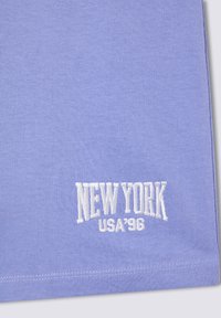 Canottiera bianca a coste abbinata a pantaloni corti in cotone azzurri chiari, con cintura elastica e grafica "NEW YORK" in bianco.