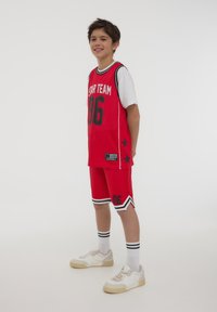 Maglia da basket rossa con dettagli neri, con la scritta "STAR TEAM" e il numero "86", abbinata a pantaloni corti coordinati e scarpe da ginnastica bianche.