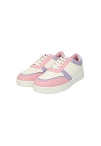 Sneakers con base bianca, caratterizzate da accenti rosa e lavanda. Punta arrotondata, texture liscia e dettaglio azzurro sul tallone.