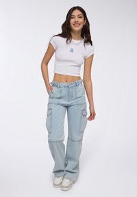 T-shirt bianca corta con ricamo di un orsetto blu sul petto, abbinata a pantaloni cargo azzurri chiari con più tasche.